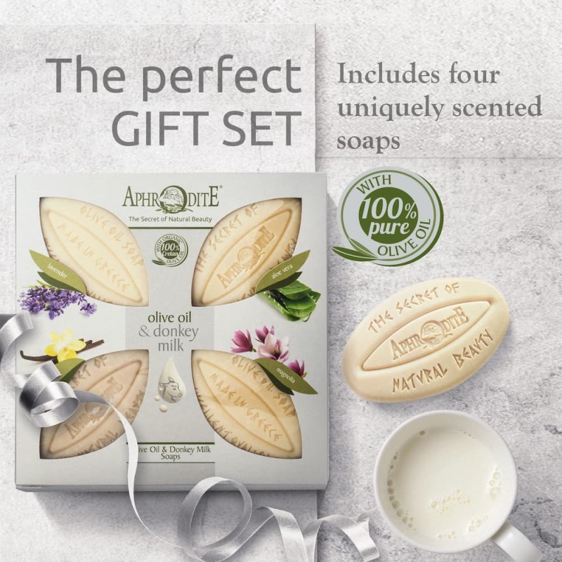 Dieses Set enthält vier super feuchtigkeitsspendende, exklusive Aphrodite Olivenöl- und Eselsmilchseifen, elegant verpackt in einer blumigen, von Schmetterlingen inspirierten Geschenkbox. Mit unserem duftfreien Aloe-Vera-Riegel oder der milden Vanilleseife kehren Sie zu den Grundlagen zurück… oder lassen Sie sich mit unseren Lavendel- und Magnolien-Optionen in die Berge und auf die Küste befördern. Welche Seife Sie auch immer verwenden, Sie werden sich belebt, gestärkt und selbstbewusst fühlen.