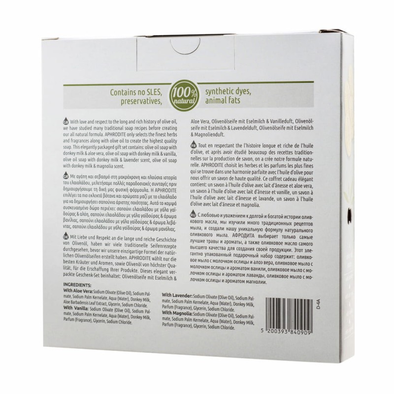 Elegantly packaged in a floral, butterfly-inspired gift box, this set features four of our super moisturising olive oil and donkey milk soaps, exclusive to Aphrodite. Get back to basics with our unscented aloe vera bar, or our mild vanilla soap… or invoke the scents of mountain and coast with our lavender and magnolia options. Whichever soap you use, you’ll be left feeling invigorated, uplifted, and in charge of your own skin.