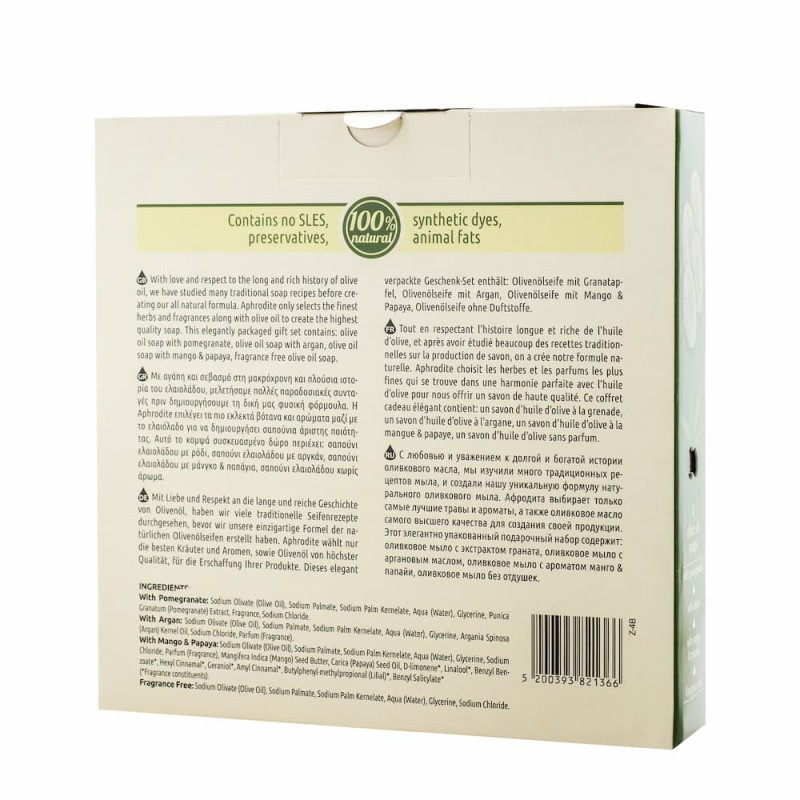 We’re proud to put the Aphrodite name on all our skincare products. But this four soap gift set is one we couldn’t wait to put our signature on. Made with pure olive oil, we’ve added the lightweight hydration of mango butter, deep conditioning properties of argan, and antioxidant qualities of pomegranate into our Signature Collection gift set for the ultimate present. We’re throwing in our classic fragrance free soap, too, to show the power of pure nature.